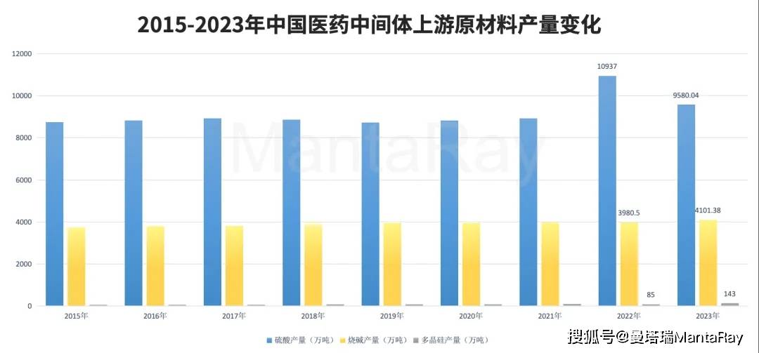 根据数据显示,中国医药中间体上游主要原材料产量基本呈现逐年上涨态势,2023年我国硫酸产量为9580.04吨,烧碱产量为4101.38万吨,多晶硅产量超过143万吨。