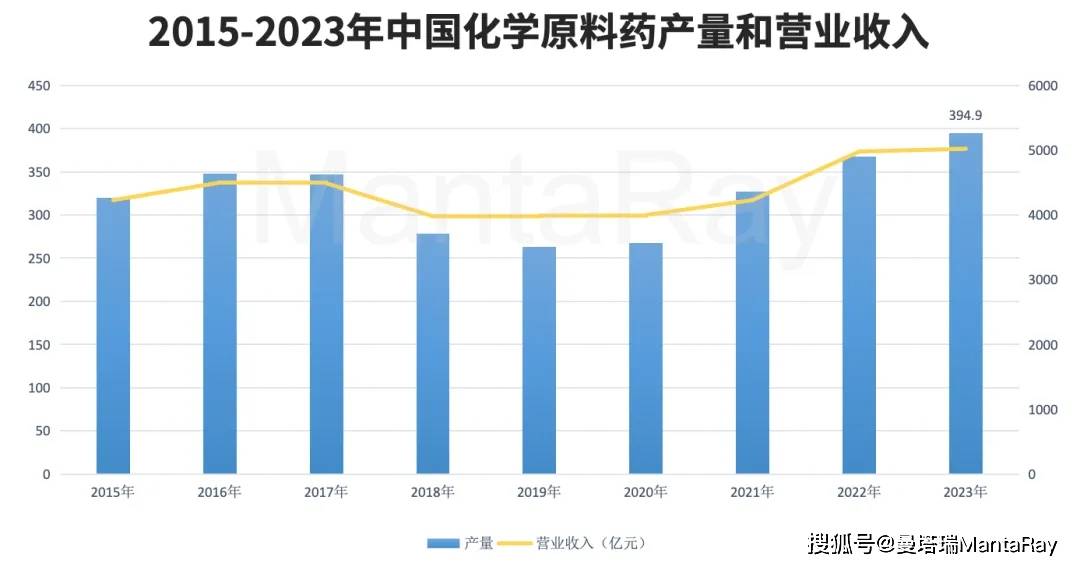 医药中间体是原料药在合成过程中需要用到的化学原料或产品,而原料药又是用于生产各类制剂的原料药物,是制剂中的有效成分。因此,医药中间体受下游化学原料药和制剂的发展影响显著。随着人们生活水平的提高,老龄化程度攀升,药品的需求量在很长一段时间呈上升态势。因此,全球药品市场的增长很大程度上影响到整个中间体及原料药行业的发展。据数据显示,2023年全国化学药品原料药产量为394.9万吨。