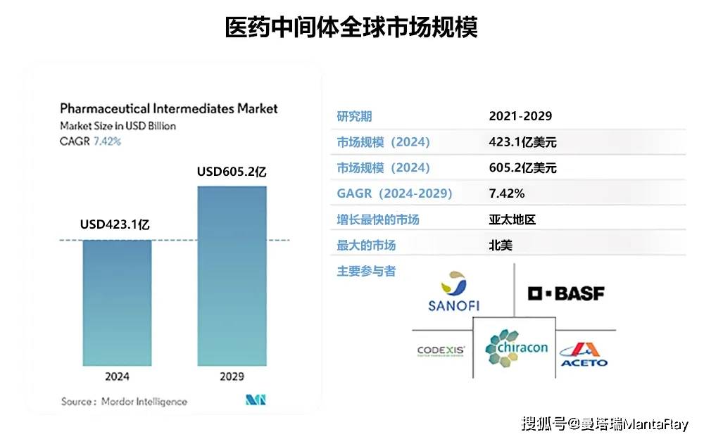 2024年全球医药中间体市场规模预计为423.1亿美元,预计到2029年将达到605.2亿美元,在预测期内(2024-2029年)复合年增长率为7.42%。