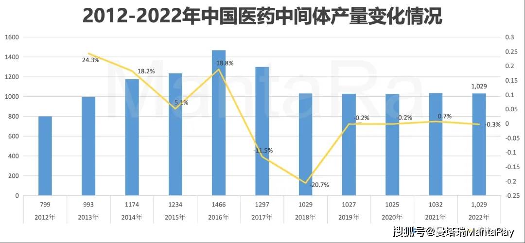 在医药中间体行业发展初期,因投资较小,利润水平高于普通化工产品,而市场准入门槛比较低,导致大量小型化工企业进入医药中间体领域,使得产量快速增长。2012年至2016年中国医药中间体产量持续增长,2016年以后,因行业市场化程度不断提高,同时受环保压力影响,我国医药中间体产量有所下滑。2020年至2021年,受疫情影响,国际社会对抗疫相关原料药需求旺盛,因此部分原料药需求有所回升,一定程度上刺激了医药中间体行业的发展。据数据显示,2021年我国医药中间体产量与2018年持平为1,032万吨,2022年较2021年小幅度下降为1,029万吨。